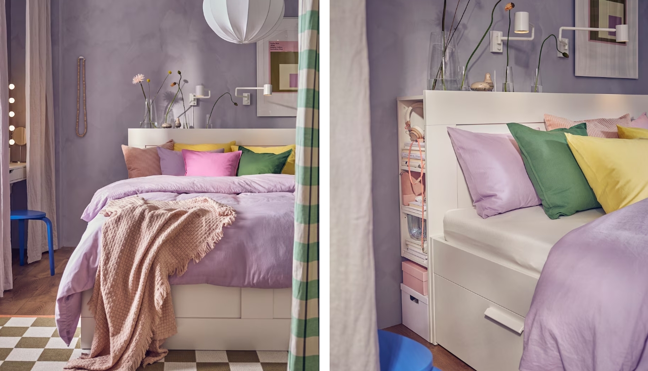 色彩和图案的大胆组合与淡紫色背景相得益彰,这间充满趣味的卧室可以为你带来丰富的可能性,尽显鲜明的个性风格。同时,它也是你的舒适港湾。因为这里有舒适睡床,床上堆着多个靠垫,旁边的窗帘赋予墙壁一抹柔和感,为你营造出趣味十足的休憩港湾。
