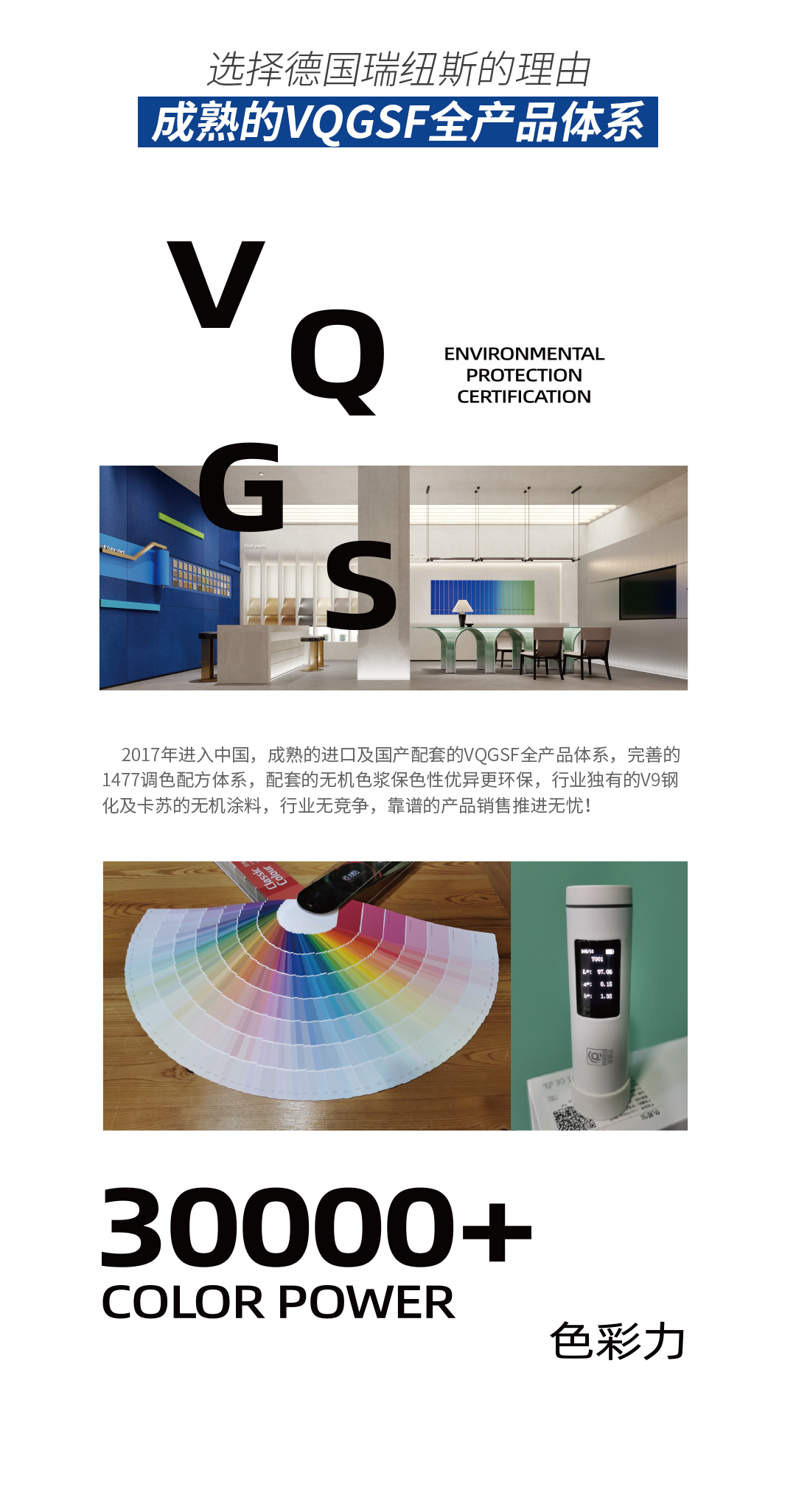 2017年进入中国,成熟的进口及国产配套的VQGSF全产品体系,完善的1477调色配方体系,配套的无机色浆保色性优异更环保,行业独有的V9钢化及卡苏的无机涂料,行业无竞争,靠谱的产品销售推进无忧!