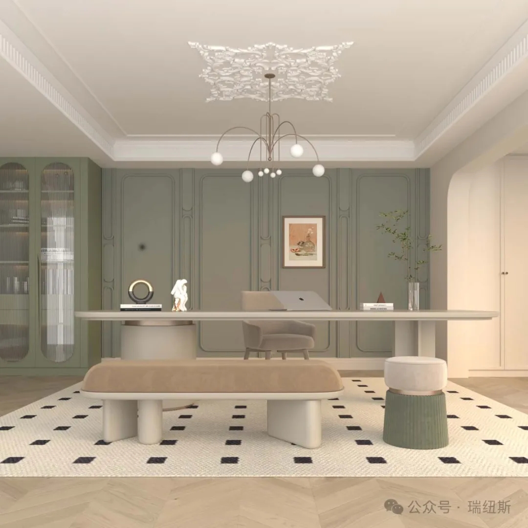 烟绿色充满生机与活力。它宛如春日里的一抹清新,为空间带来自然的气息。烟绿色不张扬却格外引人注目,给人一种舒适而宁静的感觉。在这样的书房中,仿佛置身于大自然的怀抱,让人心情愉悦。搭配木质的家具,更能凸显自然质感,营造出温馨而惬意的氛围。