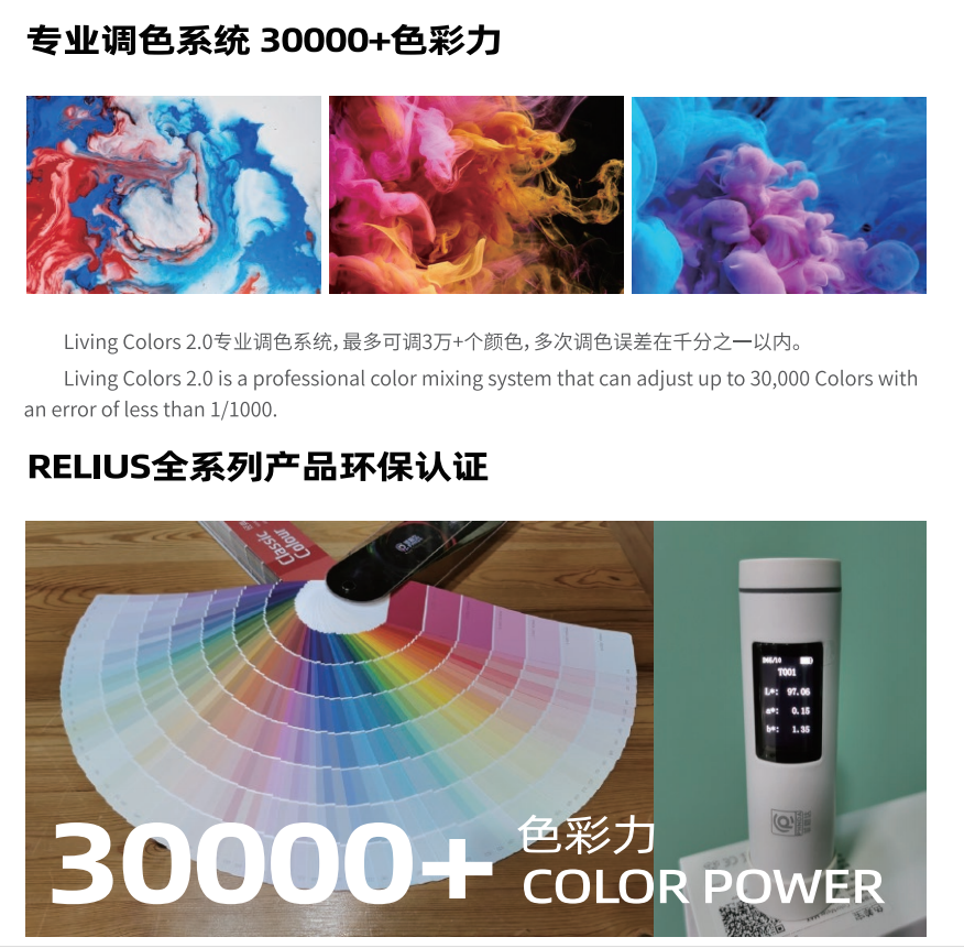 瑞纽斯拥有 Living Colors 2.0 专业调色系统,色彩丰富细腻,最多可调配 30000 + 个颜色。其获得了 E.L.F 认证、莱茵认证、德国蓝天使认证、法国 A + 认证等国际认证,充分彰显了环保品质。同时,耐磨易擦洗的特性,为书房的日常使用增添了便利,又能提升美感。