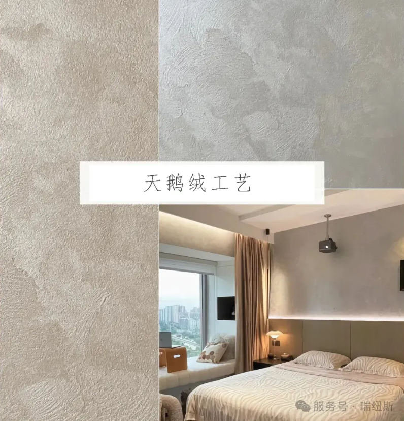天鹅绒是一种具有独特质感与优雅视觉效果的墙面处理技术。它的特点是让墙面拥有天鹅绒般柔软、细腻的质感和光泽。瑞纽斯G9艺术涂料在干燥后会形成一种类似天鹅绒的表面效果,用手触摸有柔软的触感。它的光泽比较柔和,不是那种刺眼的亮光,而是带有一种朦胧的美感。