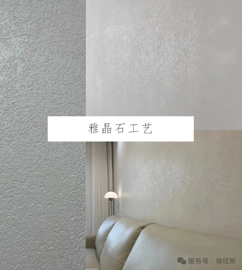 雅晶石是一种具有立体感和质感的墙面处理技术,能够在墙面上创造出立体感很强的效果,仿佛墙面镶嵌了晶石一样。瑞纽斯G9艺术涂料中通过特殊的施工手法,使涂料在墙面上形成错落有致的立体纹理,这些纹理能够反射光线,并与细腻的底色相互映衬,营造出深邃而内敛的视觉效果。